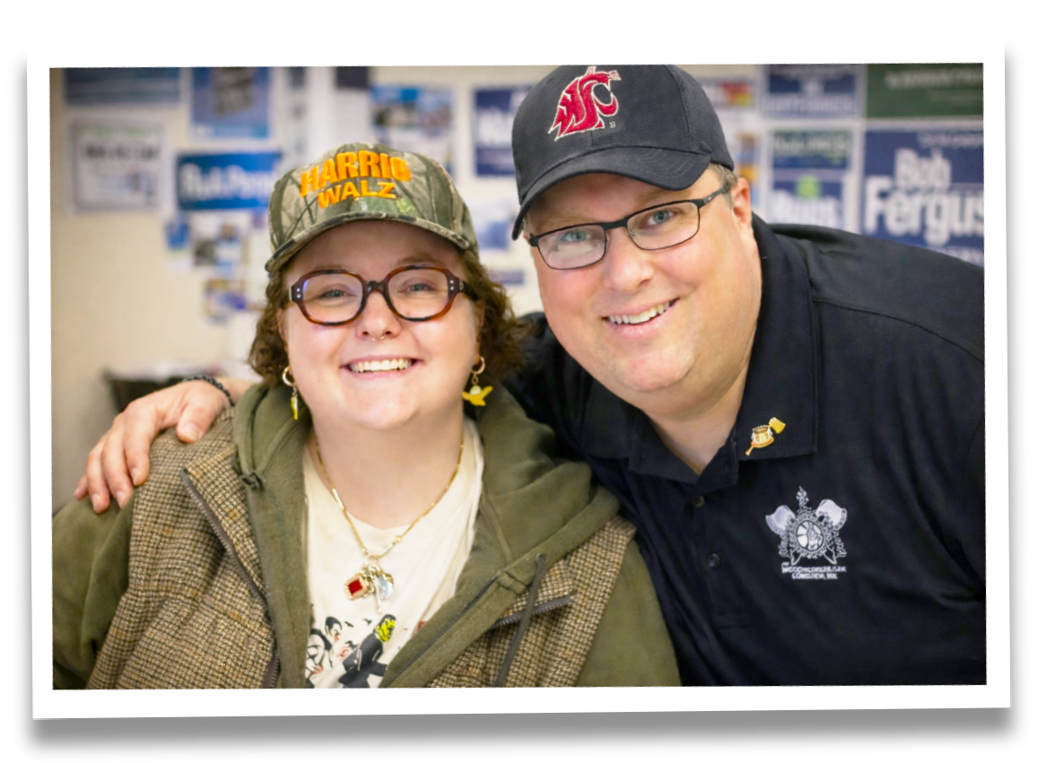 TERRY MOVED FROM LOGGING WORK TO UNION WORK WHEN HE SAW THE PROFOUND EFFECT UNIONS CAN HAVE WHEN THEY FIGHT FOR WORKERS. HE'S IMMENSELY PROUD OF HIS WORK AS PRESIDENT OF THE COWLITZ-WHAKIAKUM CENTRAL LABOR COUNCIL, WHERE HE REPRESENTS WORKING PEOPLE, FIGHTS FOR THEIR RIGHTS, AND WORKS HARD TO MAKE THEIR LIVES BETTER. BUT NOTHING MAKES HIM PROUDER THAN THE THREE DAUGHTERS HE RAISED TO BE GOOD, KIND, AND HONEST PEOPLE.